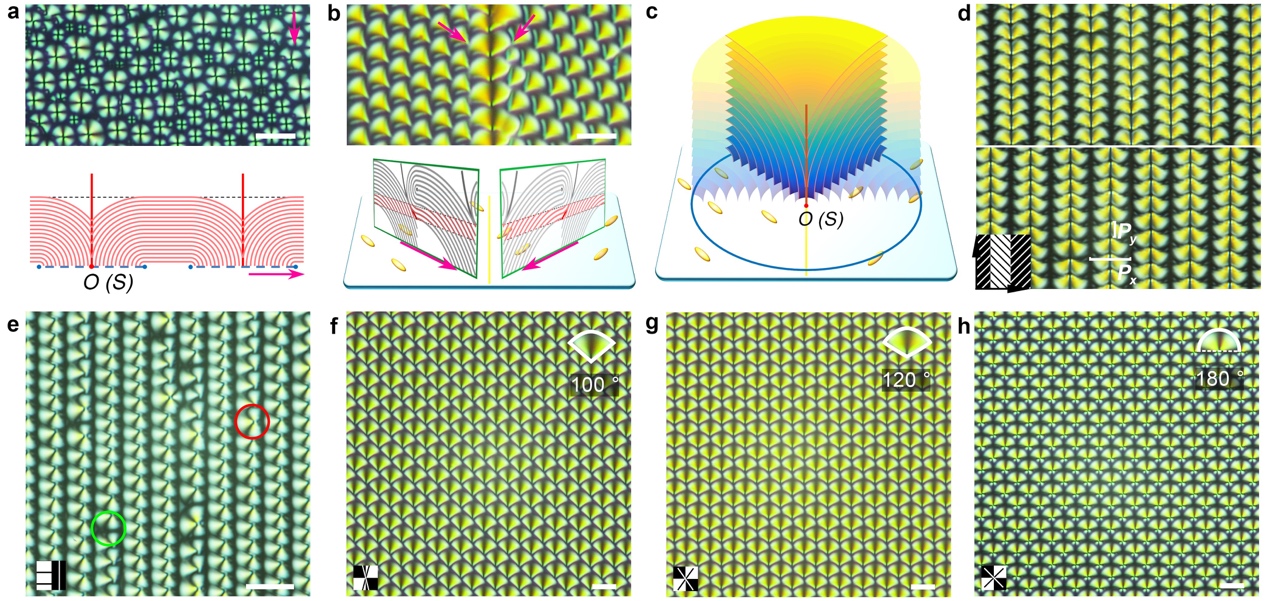 公司胡伟、陆延青团队创造性地将动态掩模光取向技术引入近晶相液晶超结构控制,将“自上而下”的图案化取向与“自下而上”的液晶分子组装相结合,证实了上述分子层“折纸术”的设想。首先,引入两个相邻±45°取向的区域,在各自区域内,缺陷线倒向取向方向,形成扇形的square FCDs(SFCDs);但在边界区域,相邻的分子层连接形成半圆形畴(图1b)。这是由于在两侧取向的方向上,液晶分子受取向剂表面锚泊力的影响,沿该方向排列,而另外一半由于与表面取向发生冲突而受到抑制,最终只生成半个TFCD(图1c)。这打破了传统TFCD的旋转对称性,进而引入了形状和方向两个全新的几何维度。当引入周期交替的±45°取向时,可诱导出朝向完全相反的半环面焦锥畴阵列,由于要满足与取向层方向吻合,两种情形会错开半个周期(图1d)。当相邻取向方向变为0°和90°时,半环面焦锥畴阵列的朝向变为±45°,由于此时取向对两种情况均不违背,两者出现在同一列中,由3/4 TFCD或垂面区连接(图1e)。在6 μm到 16 μm的周期范围内,畴的大小完全由预设的取向周期控制;当超过此范围,同一周期内会产生新的SFCD;而小于此范围,液晶层能接受到相邻取向区的影响,造成缺陷线偏向平均取向方向,也形成类似SFCD的畴。当进一步引入二维棋盘格形状的二元取向,并使相邻区域的取向角度从±15°变化到±45°, 研究人员获得了内角从100°到180°的不同Fragmented TFCDs(图1f-h)。这说明近晶相液晶焦锥畴的任何几何要素(大小、形状、方向、倾角)都可以通过合理的预设取向方向和图形来进行合理的控制;另外,由于每个畴的缺陷点精确坐落于取向边界的交叉点上,这使得精确操控畴的位置排列成为可能。