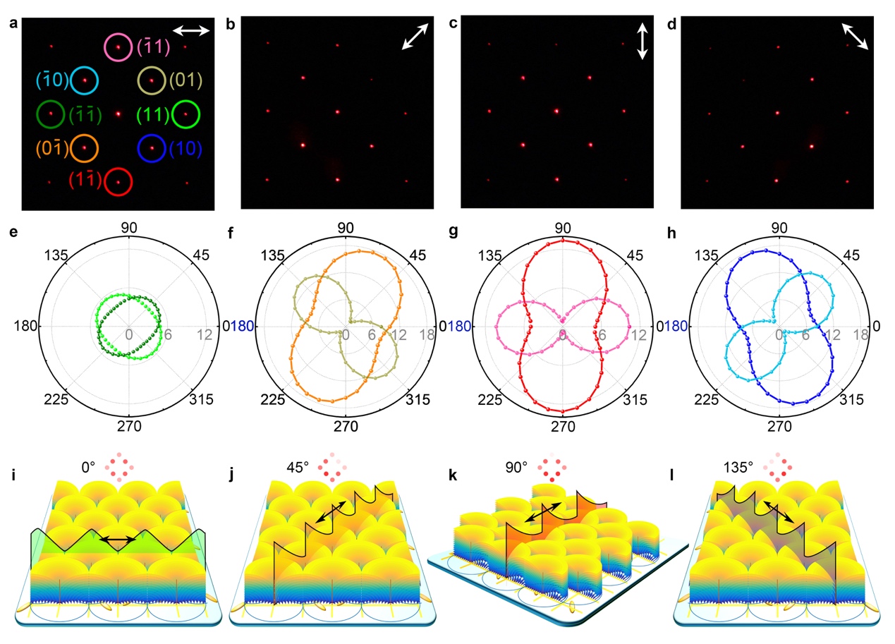 该类近晶相液晶焦锥畴打破了环面焦锥畴的旋转对称性,加上液晶材料自身的光学各向异性,呈现出了新颖的偏振依赖的不对称衍射现象。对图1h所示样品进行衍射实验,其衍射图样很好的反映了结构的对称特点(图2a-d)。随着入射偏振旋转,不同衍射级呈现出不同的变化规律(图2e-h)。这源于该类液晶畴独特的超结构。研究者对图2a-d所对应的情形进行了分析:对图2j所示情形,水平偏振对应着一组对称的锯齿形相位截面,所以在图2a中,所有的衍射斑点是左右对称的;而对于图2k-l所示的几种情形,对应的都是非对称的锯齿形相位截面,因而产生了类似闪耀光栅的衍射现象(图2b-d)。