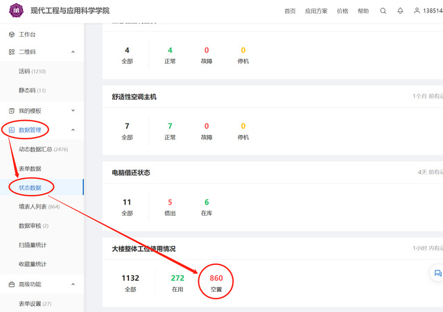 1.查询人员登陆二维码系统,在左侧菜单栏选择:数据管理--状态数据,在大楼整体工位使用情况栏点击“空置”按钮,进入下一页面。