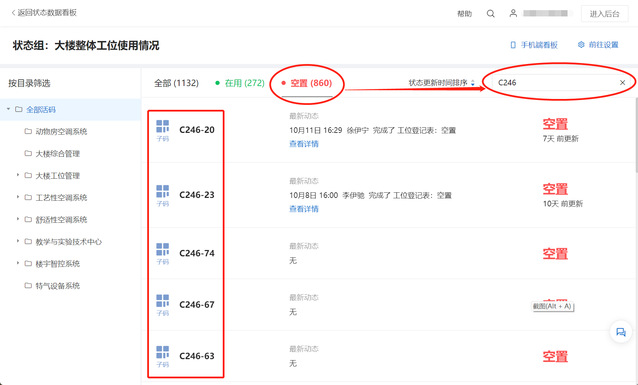 2.在页面点击红色“空置”按钮,再用右侧搜索栏输入要查询的房间号,即可得到空置工位信息,同理也可查询在用工位信息。
