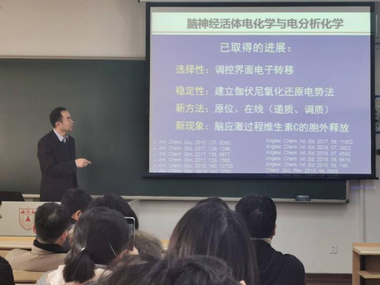 毛兰群研究员的PPT图文并茂,报告生动有趣,讲坛气氛十分活跃。提问环节中,在场的老师同学灵活思考、积极提问,提出了“除大脑处神经元细胞胞外,人体其他器官内是否也具有如此高浓度的抗坏血酸,且是否同样也有着关键性生理作用”、“人体固有电阻对临床应用的影响”、“Vc与神经递质的共释放机理”等问题,毛老师均一一慷慨解答并与大家亲切互动。最终,讲座圆满落幕。