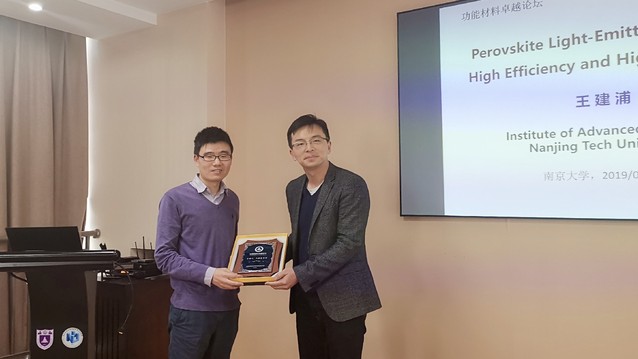 2019年4月17日下午两点,“功能材料卓越论坛”第一期第二讲在唐仲英楼B501开讲。本次论坛邀请到的嘉宾是南京工业大学先进材料研究院常务副经理王建浦教授。报告题为“钙钛矿发光二极管:高效率和高亮度”。报告由江苏省功能材料设计原理与应用技术重点实验室教授鲁振达主持,朱嘉教授代表实验室向王建浦教授赠送讲坛纪念品。吴迪,朱嘉,张伟华,邓正涛,鲁振达,谭海仁、电子学院潘力嘉等教授参加了讲座。