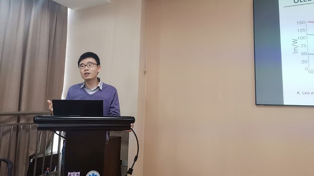 王建浦老师介绍了他们团队针对二维钙钛矿材料发光效率低,三维钙钛矿材料成膜性和稳定性差的问题,创造性地采用溶液加工方法将无机LED中用于提高器件发光效率的量子阱结构引入到钙钛矿LED中,开发了具有多量子阱结构的钙钛矿发光材料,兼具二维钙钛矿材料成膜质量高和三维钙钛矿材料发光效率高的优点。利用这种维度可调的多量子阱钙钛矿材料,创造了钙钛矿LED能量转换效率的世界最高纪录。同时,他们在世界上首次通过自发形成的具有亚微米尺度的离散型钙钛矿,使LED的光提取效率得到大幅度提升,在低成本、高亮度、大面积LED领域展现出独特的应用潜力。