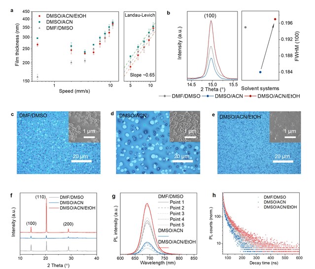 图2. 刮涂钙钛矿薄膜的结晶动力学和薄膜性质。(a)不同溶剂的Landau-Levich曲线;(b-e)不同溶剂对应的钙钛矿薄膜的结晶动力学;(f-h)薄膜性质表征。