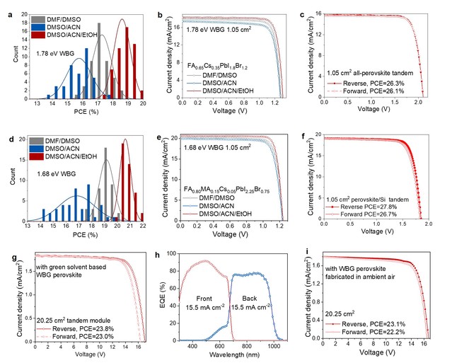 利用这种绿色溶剂体系,研究人员成功制备了带隙值为1.78 eV和1.68 eV的宽带隙钙钛矿太阳能电池,分别实现了19.6%和21.5%的高光电转换效率。在此基础上,制备了1 cm2的全钙钛矿和钙钛矿/晶硅叠层太阳能电池,分别达到了26.3%和27.8%的光电转换效率;此外,大面积全钙钛矿叠层光伏组件也实现了23.8%的光电转换效率。更令人振奋的是,该绿色溶剂体系适于在大气环境下制备宽带隙钙钛矿太阳能电池,在大气条件下制备宽带隙子电池的全钙钛矿叠层组件实现了23.1%的光电转换效率。