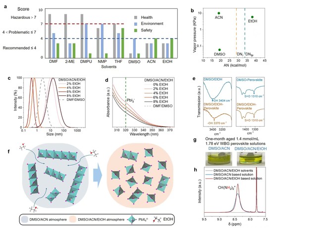 图1. 钙钛矿前驱体溶液的作用力和胶体性质。(a)不同常用溶剂的危害程度示意图;(b-f)乙醇与铅卤化合物的作用力表征及其对应的胶体性质变化;(g-h)乙醇防止溶液降解的表征。