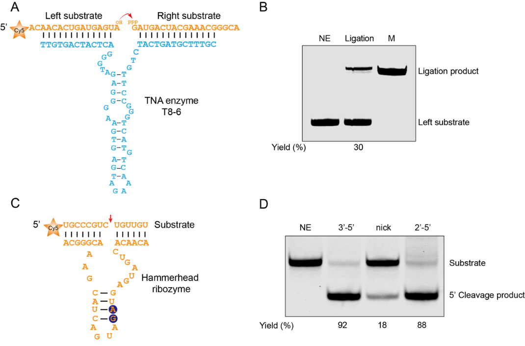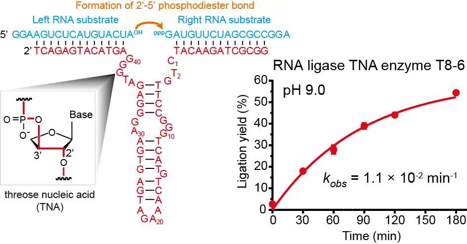 核酸是生命体的基本组成成分,包括DNA和RNA。其中细胞内的RNA既可以存储和传递遗传信息,又能够催化生物化学反应。RNA具有丰富的生物功能多样性,促使研究生命起源的科学家提出了“RNA世界假说”,认为在地球生命演化的早期,存在仅依赖于RNA的生命形式。但是RNA是不是唯一可能的遗传物质呢?为了探索这个问题,Eschenmoser等合成了一系列RNA类似物并研究了其基本的物理和化学性质。在这项研究中,他们发现了苏糖核酸(threose nucleic acid,TNA)能够与互补的RNA、DNA或TNA链遵循碱基配对原则形成反向平行的双螺旋结构。而且,考虑到TNA由更简单的苏糖组成,所以TNA被视作演化过程中一种可能的前RNA遗传物质。作为前RNA遗传物质,需要TNA具备形成功能性高级结构的能力。已有工作证明了TNA可以折叠成具有配体结合能力的高级结构,那么TNA是否具有催化活性呢?