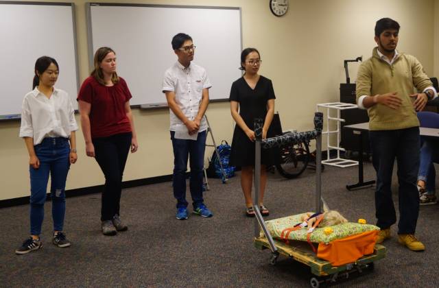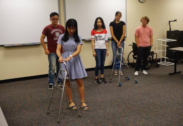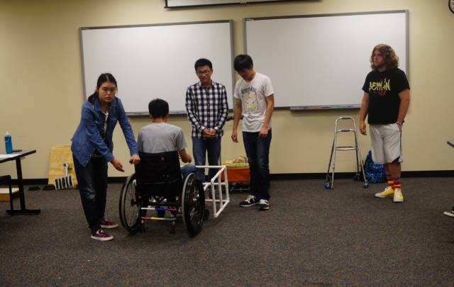 第四组设计的是给偏瘫患者复健使用的hemi-walker。传统的hemi-walker需要使用者在前进过程中将其提起,这对行走困难的偏瘫患者十分不便。于是,小组成员们在其底部加上了轮子,并在两个后轮上加上了刹车装置。当使用者想要停下休息时,他们可倚靠在hemi-walker上,利用自身重量将其压下,此时后轮旁的橡胶便会将整个装置牢牢的固定在地上,避免滑动。