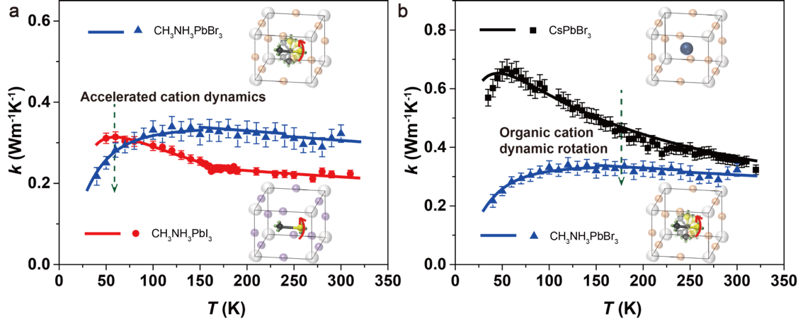 基于上述背景,朱嘉教授课题组利用悬空热桥方法系统测试了CH3NH3PbI3, CH3NH3PbBr3和 CsPbBr3三种钙钛矿纳米线的热导率。测试结果(图一)展示出在35 K到325 K的测试温度区间内,三种材料随温度变化的热导率 。通过实验数据与理论分析,可以发现它们的热传输特性受到阳离子动力学控制。一方面,由于有机阳离子的作用,使得CH3NH3PbBr3 结构内无序度增加,其热导率与CsPbBr3相比受到显著抑制。另一方面,两种有机-无机杂化钙钛矿相比, 在低温区CH3NH3PbBr3结构内受阳离子动力学影响具有更高的无序度,使其在低温区热导率更低;而在高温区热导率受阳离子动力学影响减弱,由于CH3NH3PbI3 更低的声速度与较高倒逆散射率,使其在高温区热导率更低。此项工作揭示了三种钙钛矿纳米线的本征热传输机理,对理解同类材料热学性质以及构建高性能器件具有重要意义。