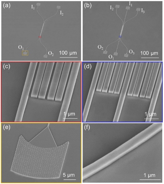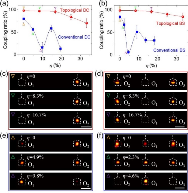 图四、(左)实验加工的拓扑结构的(a)定向耦合器与(b)分束器SEM图,以及相关的细节结构。(右)实验测试结果(a,b)耦合比随结构偏差度(η)的变化;(c-f)实验上拍摄的输出信号,(c)拓扑定向耦合器;(d)拓扑分束器;(e)传统定向耦合其;(f)传统分束;比例尺= 20μm。