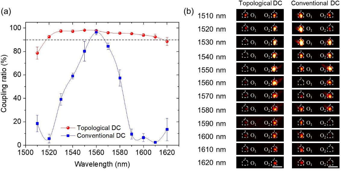 图五、耦合带宽测试实验结果。(a)耦合比随波长的变化;(b)实验上拍摄的输出信号;比例尺= 40μm。