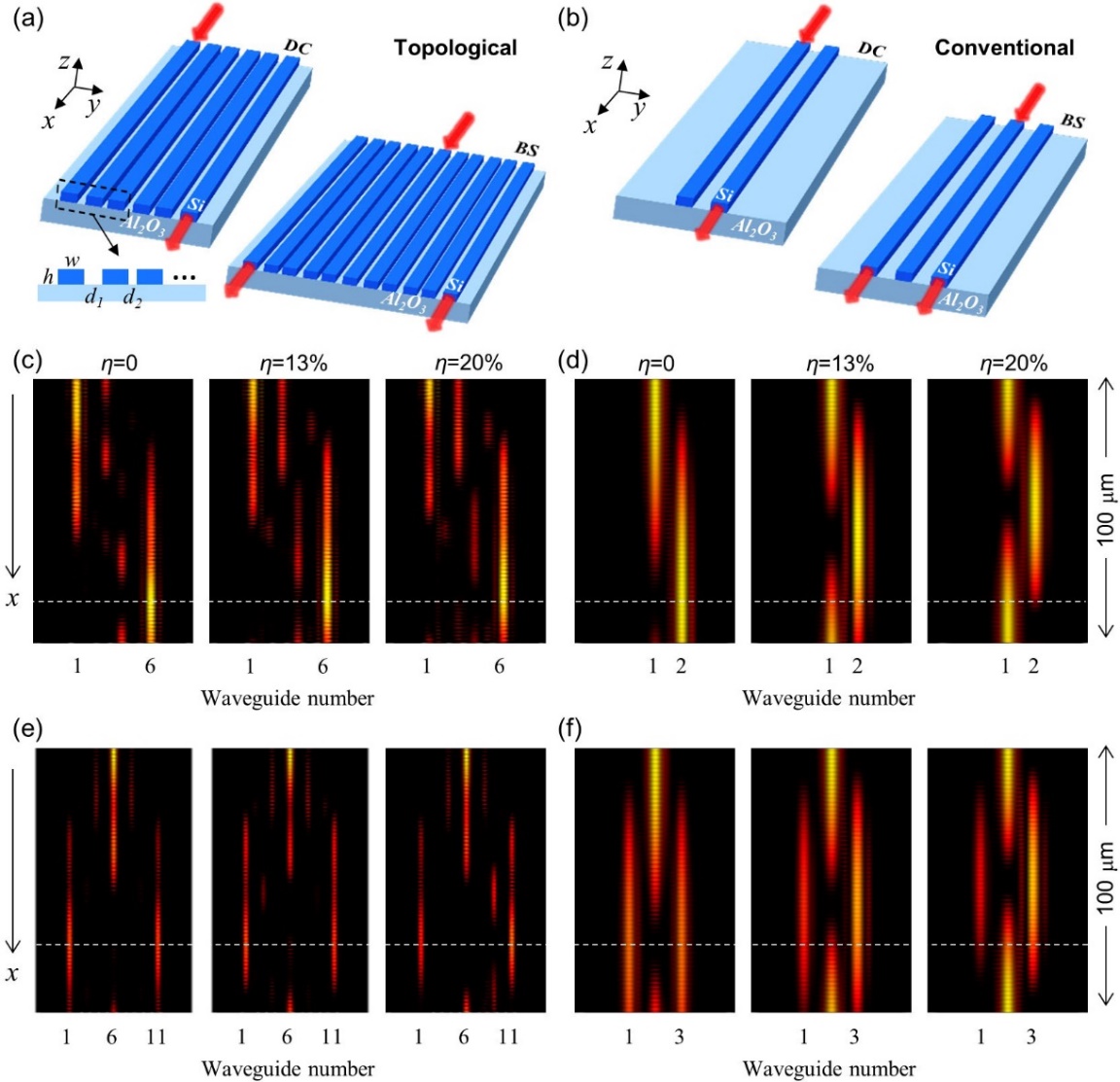 图三 基于硅波导器件的模拟结果。(a)硅波导阵列的拓扑定向耦合器和分束器结构示意图,以及(b)传统的定向耦合器和分束器的结构示意图。 在(c)拓扑定向耦合器,(d)传统定向耦合器,(e)拓扑分束器和(f)传统分束器中引入结构偏差的情况下模拟的光场传播情况。
