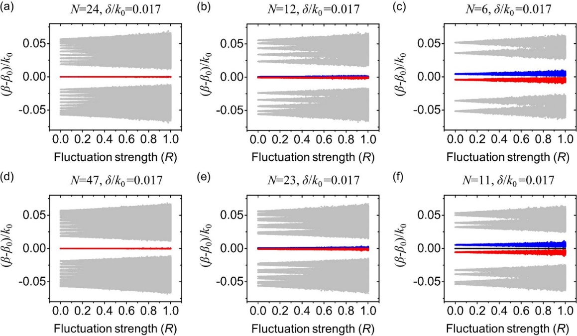 图二、 扰动对拓扑能带结构的影响。(a-c)不同参数下拓扑DC中边界态的传播常数随外界扰动强度的变化;(d-f)拓扑BS相应的结果。