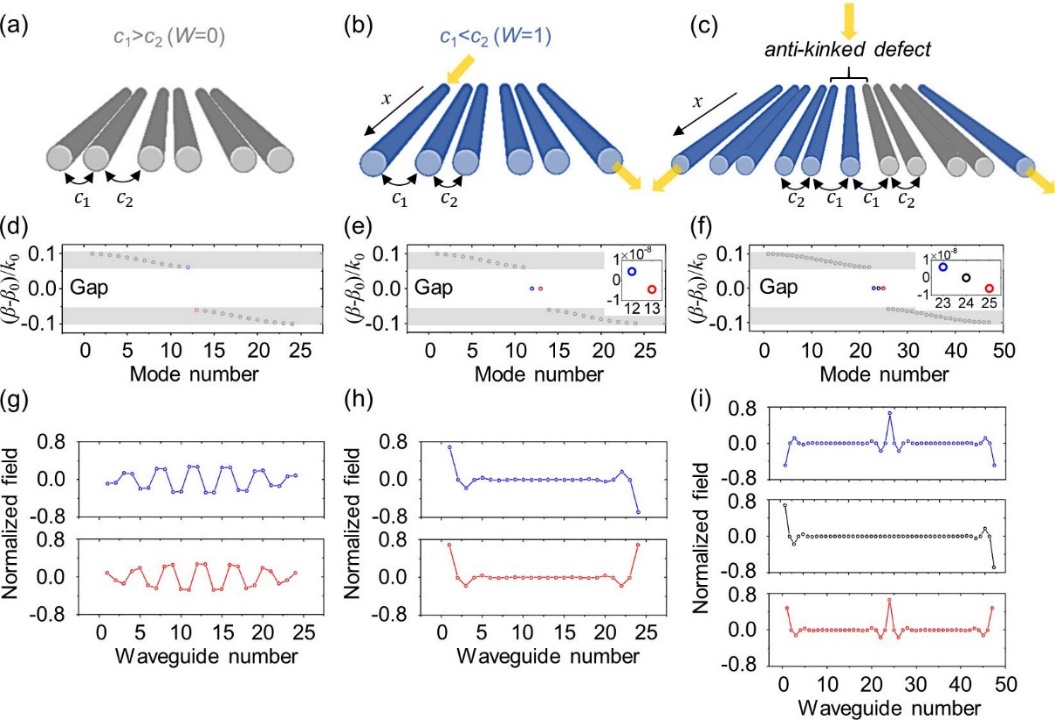 图一、拓扑波导阵列的设计。(a)一维SSH模型的拓扑平庸结构示意图;拓扑非平庸结构实现的(b)定向耦合(DC)和(c)分束功能(BS)的结构示意图;(d-f)三种结构相应的能带结构;(g-i)相应的本征模式分布。