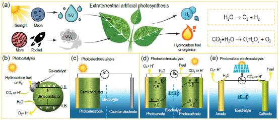 姚颖方副教授、邹志刚院士团队联合中国空间技术研究院钱学森空间技术实验室发表综述文章,首次提出支撑可承受、可持续载人深空探索的地外人工光合成可行的概念与方法。太空探索已成为人类共同目标,重返月球、载人火星等人类历史上的重大里程碑任务已逐步实施。如何实现地外极端环境下人类生存和发展已成为载人太空探索的基本能力和基础技术。由betway88西汉姆联和中国空间技术研究院钱学森空间技术实验室(下称“钱学森实验室”)提出的地外人工光合成技术,模拟地球绿色植物的自然光合作用,利用密闭空间废弃资源或地外天体环境中丰富的资源,通过光电催化方法原位、加速、可控地将二氧化碳转化成为氧气和含碳燃料,大幅度降低载人航天器的物资供应需求,支撑可承受、可持续的载人深空探索。该文章回顾了近年来国际航空航天领域利用二氧化碳转换生成氧气和碳氢燃料的方法,着重介绍了地外极端环境对人工光合成的负面影响及其可能的解决方案,深入探讨了目前可在地外实施的人工光合成技术及核心材料研究进展,期望深化对地外人工光合成材料与技术的认知,有力支撑载人航天发展。