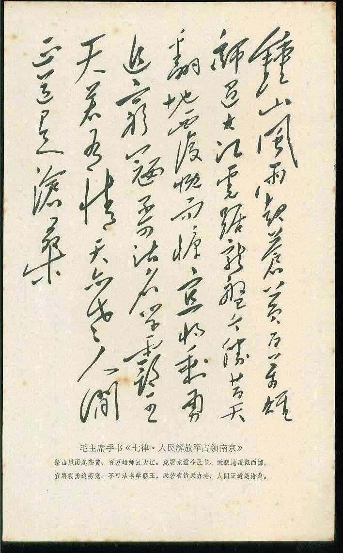 1949年4月23日,作为国民党统治中心的南京宣告解放,红旗插上总统府,中国历史进入新的篇章。毛主席欣然写下《七律·人民解放军占领南京》,抒发了欢庆南京解放的革命豪情,格调雄伟,气势磅礴,雄壮有力。