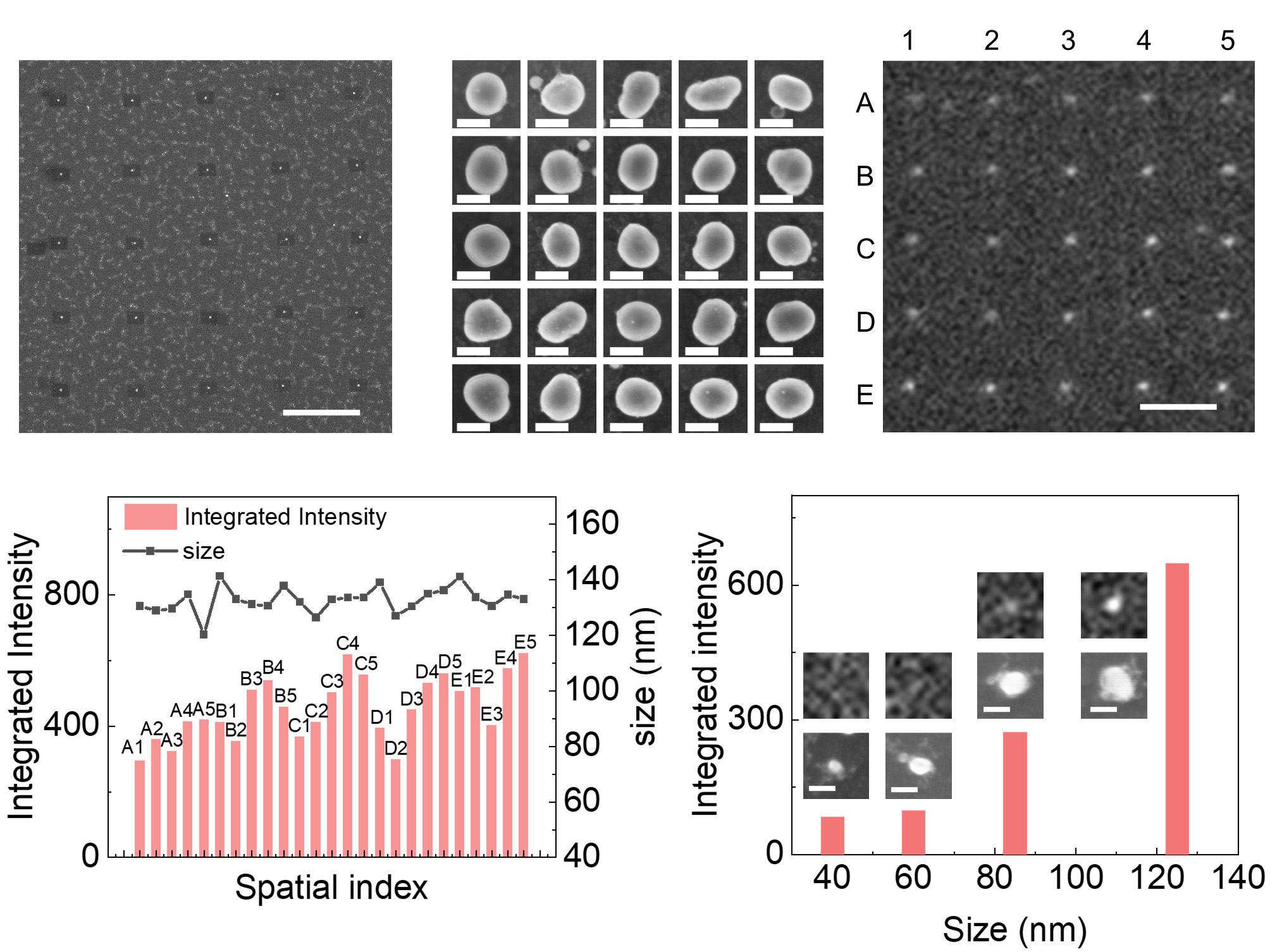 图2.金单颗粒点阵的SEM和ECL图像,以及单颗粒水平的发光强度和颗粒尺寸的统计和对比。图片来源:Angew. Chem. Int. Ed.