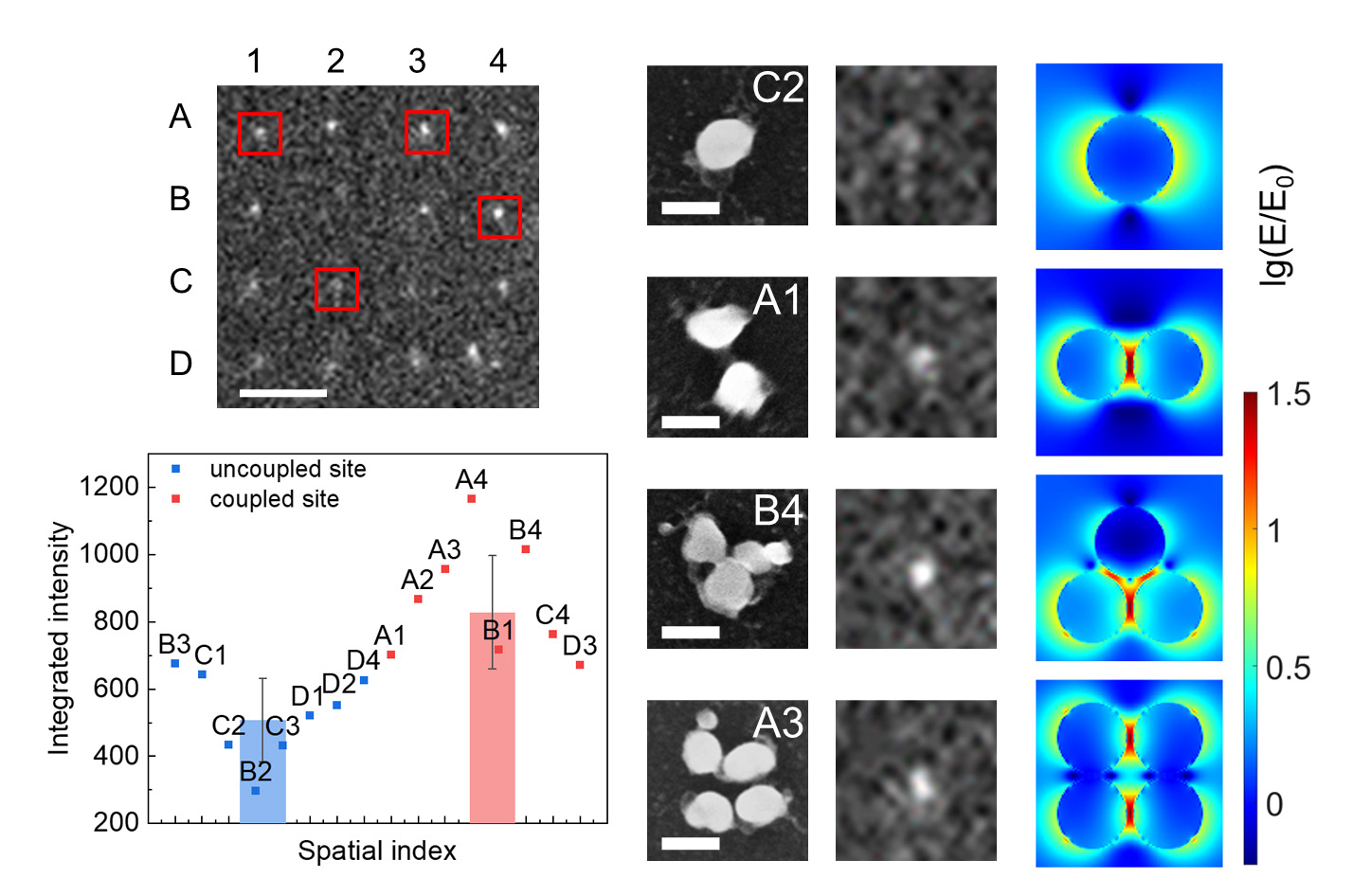 为进一步研究等离子激元对ECL的影响,得益于纳米静电印刷高度可控性,团队构建了包含单颗粒和多颗粒寡聚体的阵列结构,并在寡聚体上观察到了更为明显的ECL增强现象。得益于阵列的高通量特性,这一增强效果在位点统计中得到进一步证实。通过实验和仿真,团队发现金颗粒寡聚体散射峰红移,且在颗粒间隙中出现很强的局域电场耦合。这种邻近金颗粒的耦合效应极大提升了激发态Ru(bpy)32+*的总衰减速率,而金颗粒散射特性又增大了其辐射衰减的占比,即提高了其量子效率。