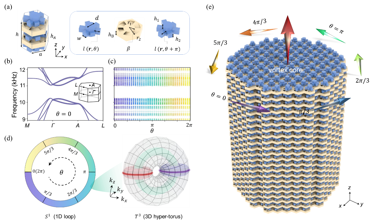 团队设计了一种可旋转调谐的双层手性人工自旋声学功能基元,形成三维拓扑声子晶体,并结合一维涡旋调制参数(狄拉克质量项)作为合成维度,构建了一个具有四维合成空间(3个动量参数和1个调制参数)的纤芯结构。在其带隙中,研究人员实现了一对沿涡旋纤芯传输的新型声拓扑模式,其拓扑特性由四维流形中的第二类自旋陈数刻画(图2)。