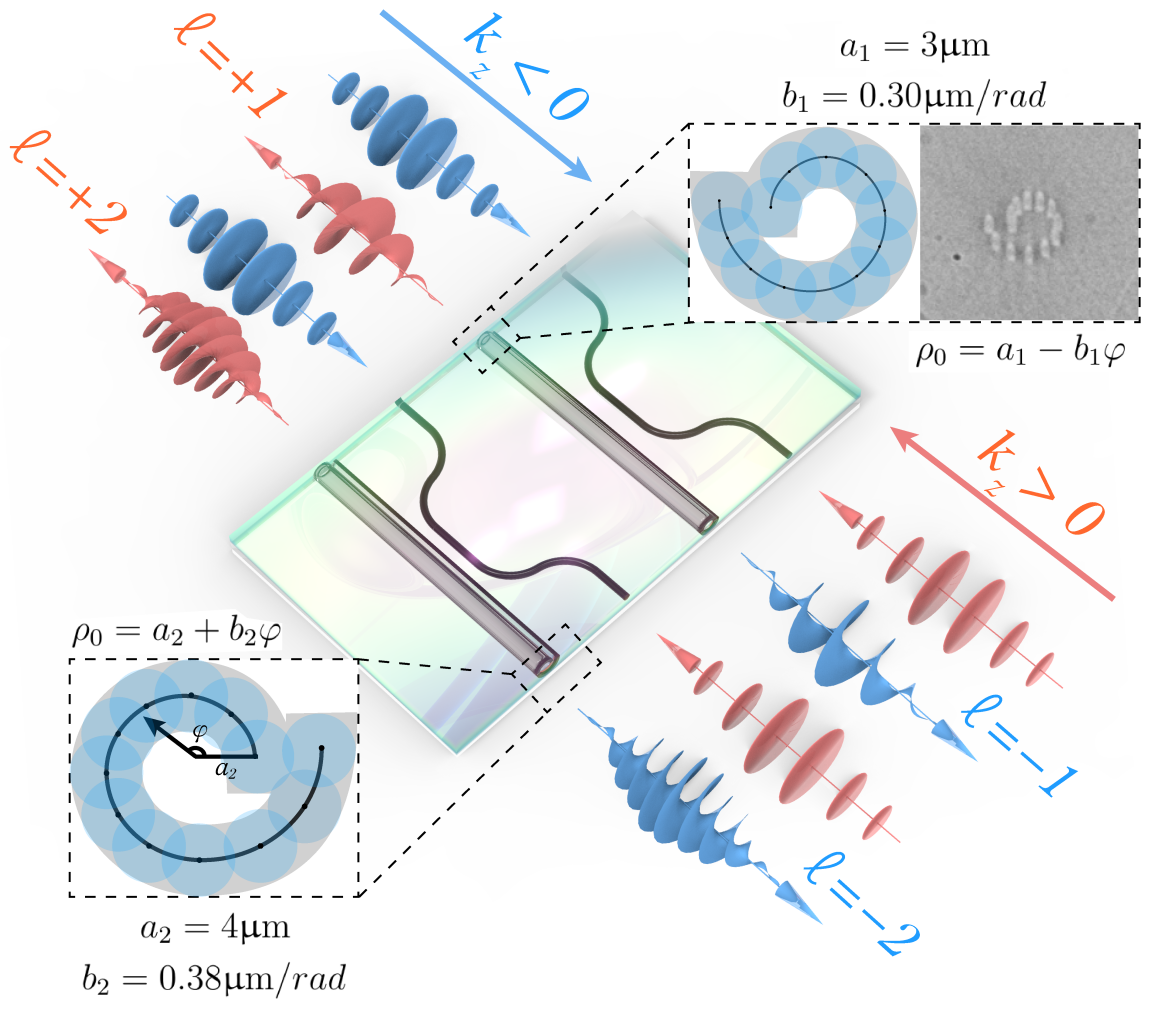 在betway88西汉姆联团队的创新理论设计基础上,上海交通大学金贤敏教授团队利用通过飞秒激光直写技术,在光子芯片上成功制备出了这种手性螺旋波导并实验观测到了这种轨道-动量锁定。 实验中,他们精确地构建了一阶(|ℓ|=1)和二阶(|ℓ|=2)的OAM发射器。团队在光子芯片内采用飞秒激光直写制备了截面呈阿基米德螺旋的螺旋波导,通过巧妙地控制螺旋结构的参数,选择性的支持一阶和二阶OAM光芯片内高质量产生。实验通过在器件两端分别注入高斯光并测量输出 OAM模式谱,结果发现实验结果与理论预测完美吻合:当高斯光束从一端输入时,芯片只输出特定拓扑荷(如+1)的涡旋光;而当光从另一端反向输入时,则会确定性地输出拓扑荷相反(-1)的涡旋光。正向入射时目标涡旋纯度维持在较高水平,反向入射则以同等纯度产生符号相反的涡旋,非目标模式被抑制至5–10 %以下。