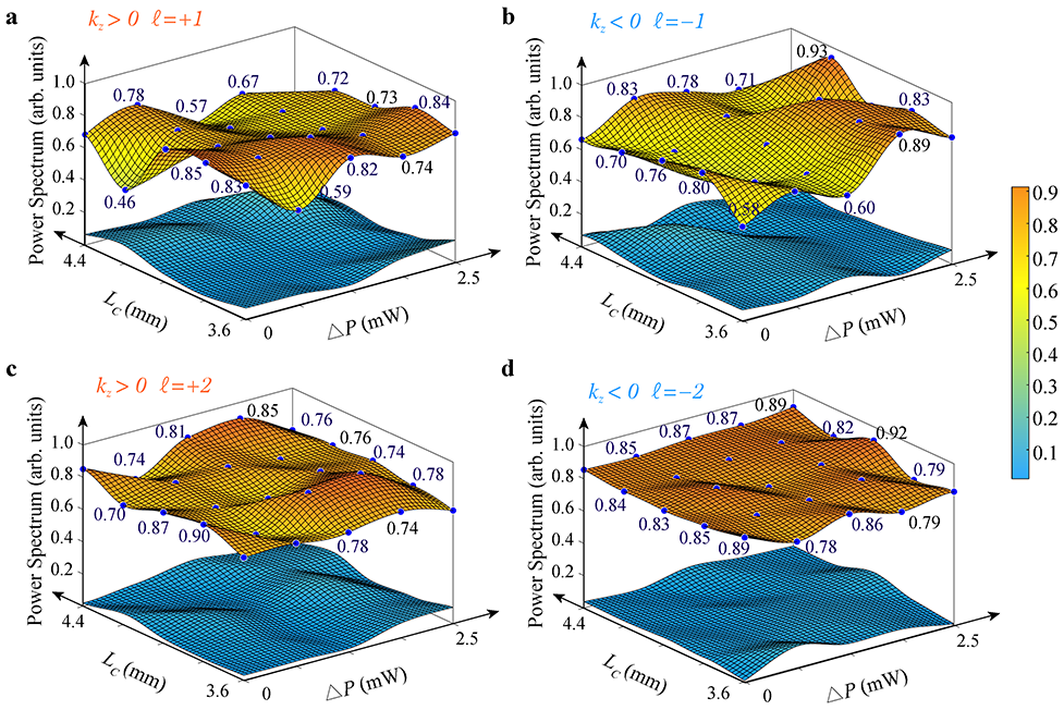 图3 不同设计参数下的手性OAM发射器的性能表征,上表面(橙色)为目标模式纯度占比,下表面(蓝色)为非目标模式纯度占比。