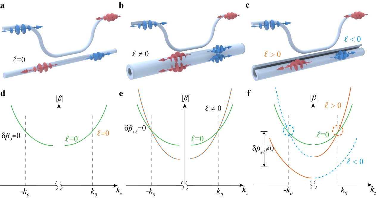 图1 OAM-momentum locking原理图。a)和d) 常规单模波导不同方向的激发均为单模;b)和e) 普通环形波导不同方向的激发会同时产生不同手性的OAM模式; c)和f) 手性结构下不同方向的激发会选择性激发不同手性的OAM模式。