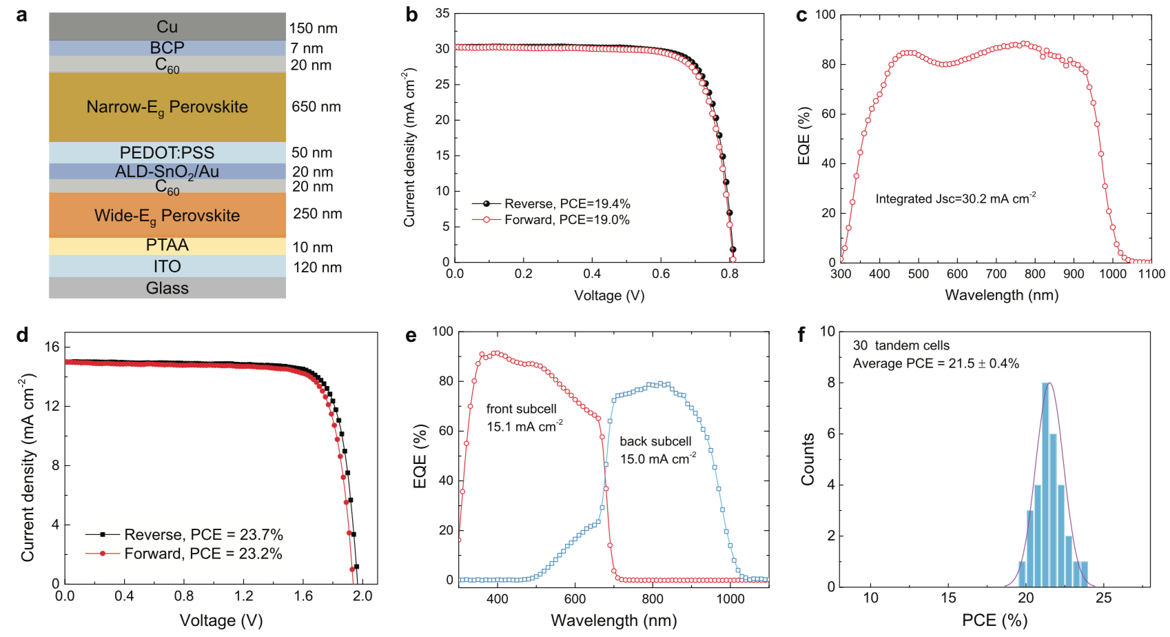 图2. 优化钙钛矿层厚度后单节Pb-Sn钙钛矿电池获得了19.4%的光电转换效率,结合宽带隙钙钛矿制备的串联型全钙钛矿叠层电池效率达到