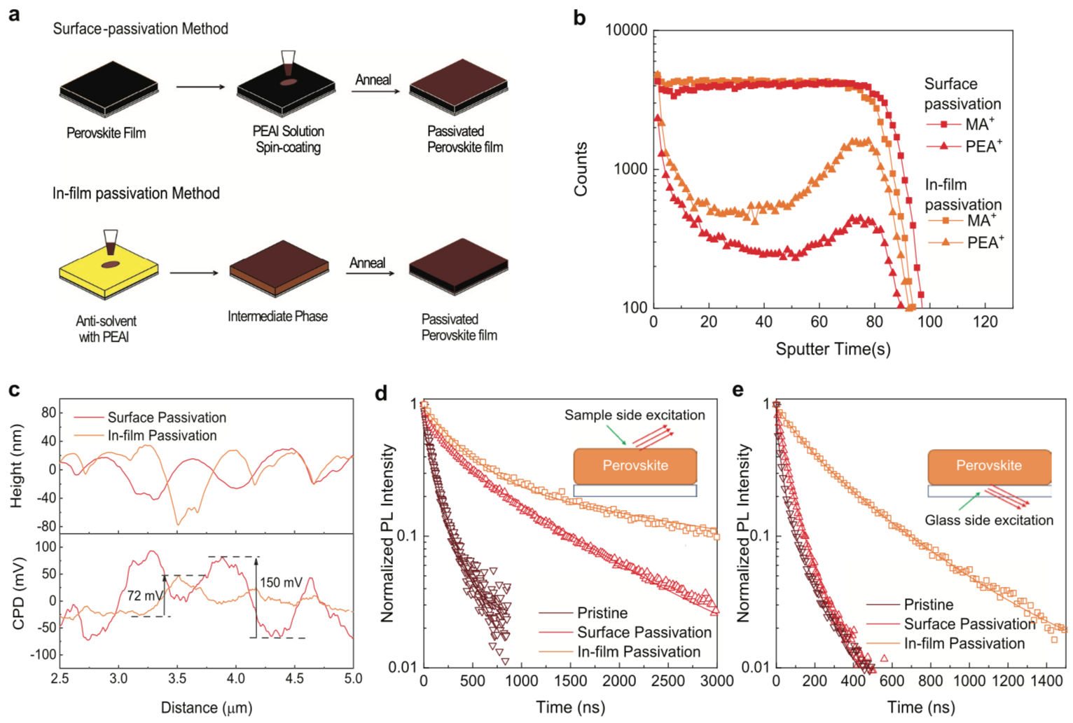 图1. 与表面钝化相比,在反溶剂中添加苯乙胺提升钙钛矿内部的均匀钝化。