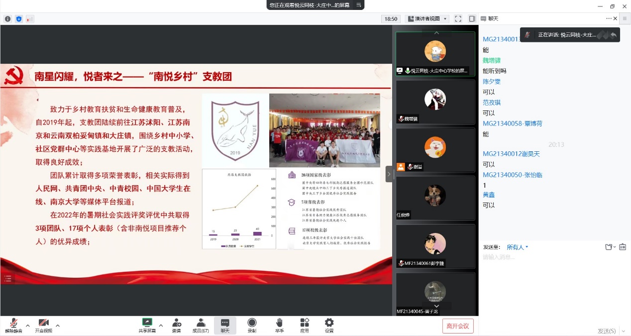 邵昱宁同学表示,习总书记在回信中提到的话不仅鼓舞了他继续深耕于自己的科研课题,也激发了他投身支教事业的想法。邵昱宁同学先介绍了“南悦乡村”支教团队伍不断壮大发展的过程,又分享了他在2022年7月随支教团前往云南省楚雄州双柏县大庄中心学校的支教经历。邵昱宁同学说,随着支教志愿工作的推进,他对“乡村教育”、“发展不平衡”、“理论融入实践”和“乡土情怀”等概念有了更深刻的认识,也坚定了他继续投身于民族复兴事业的决心。谢溢同学介绍了“工享新知”科普讲师团,并分享了她在科普讲师团的经历。她希望各位同学可以分享自己的热爱,将这份热爱传递出去,并鼓励同学们踊跃加入科普讲师团,为中国的科普事业贡献出自己的一份力量。