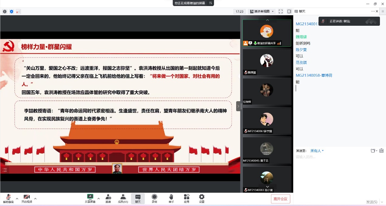随后,2021级硕士生第一团支部书记谢溢同学分享了李四光、程开甲等老一辈科学家的求学、留学、归国并参与社会主义建设的经历,鼓励同学们要学习老一辈科学家“艰难困苦,玉汝于成”的精神品质。随后,谢溢同学介绍了betway88西汉姆联的五位归国青年学者——谭海仁教授、姜硕星教授、任鑫坤教授、袁洪涛教授、李喆教授,并讲述了他们在各自领域的重要事迹,转达了老师们对南大青年的殷切期望。