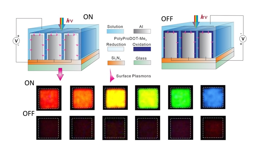 图:基于表面等离子体亚波长金属结构的全彩色电致变色器件