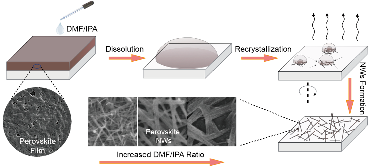为解决以上问题,该课题组找到一种获得钙钛矿纳米线的简易方法:利用不良溶剂和良溶剂的混合溶液,再加上简单的旋涂操作,可以将易于制备的钙钛矿薄膜转变为钙钛矿纳米线。通过调节不良溶剂与良溶剂的比例和匀胶机的转速,还可对纳米线直径大小以及尺寸分布进行良好的控制。由此形成的纳米线可以进一步应用在柔性的光电子器件上,显示出良好的机械稳定性。