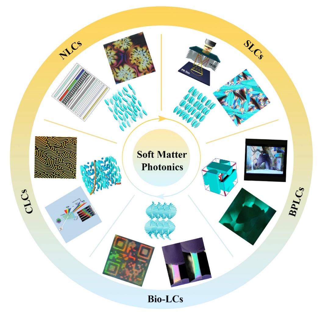 近年来,软物质光子学的研究正逐渐成为功能材料、柔性光电子、软凝聚态物理等领域的交叉研究前沿。“软物质”这一概念最早由Pierre-Gilles de Gennes在1991年的诺贝尔获奖感言中提出,描述的是介于液体和理想固体之间的材料,如胶体、泡沫、液晶、凝胶、聚合物、活性物质等,其功能组装具有自发性,同时能够灵敏感知多种外部刺激。这些特性为软物质体系在生命系统、分子器件、调光材料、生物医学等方面的应用奠定了坚实的基础。