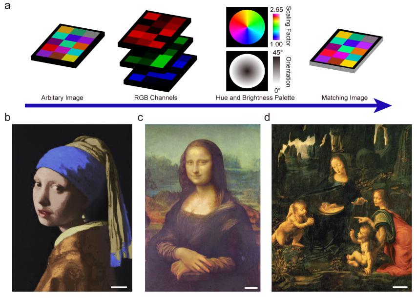 该工作提出了一种具有色散旋光效应的全银超构表面结构来产生高饱和度、高效率、广色域、明暗连续变化的结构色。模板翻转工艺使得该超构表面能被大批量的制备。该工作为科学与艺术之间架起了一座桥梁,也在纳米彩色打印、微纳显示、光学加密、隐写术等应用领域表现出了潜力。