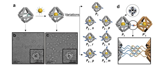 在这项工作当中,研究人员基于前期的工作开发了一种由DNA自组装形成的八面体折纸框架。这种利用DNA自身折叠而成的几何体框架结构在设计上具有独特的可编辑性,八面体的顶点和内腔都可以通过特定的设计延伸出具有连接能力的DNA链段,只需同样使用DNA链段对胶体纳米粒子进行简单的化学修饰,就可以轻松地将纳米粒子装载到八面体框架当中。研究人员借鉴配位化合物的形成方式,通过进一步调控八面体外壳顶点延伸出的DNA单链的数目和空间位置,即相当于对内部的纳米粒子完成了表面“价态”的编码。这种编码机制可以方便地对纳米粒子进行“价键”个数和位置的更改,即可以对表面的“补丁”位置和数目进行调整。并且八面体外壳顶点之间的互相连接可以操纵这种经过特殊编译的纳米粒子最终实现特定图案和结构(立方体、二维平面、双排线等)的精准装配。