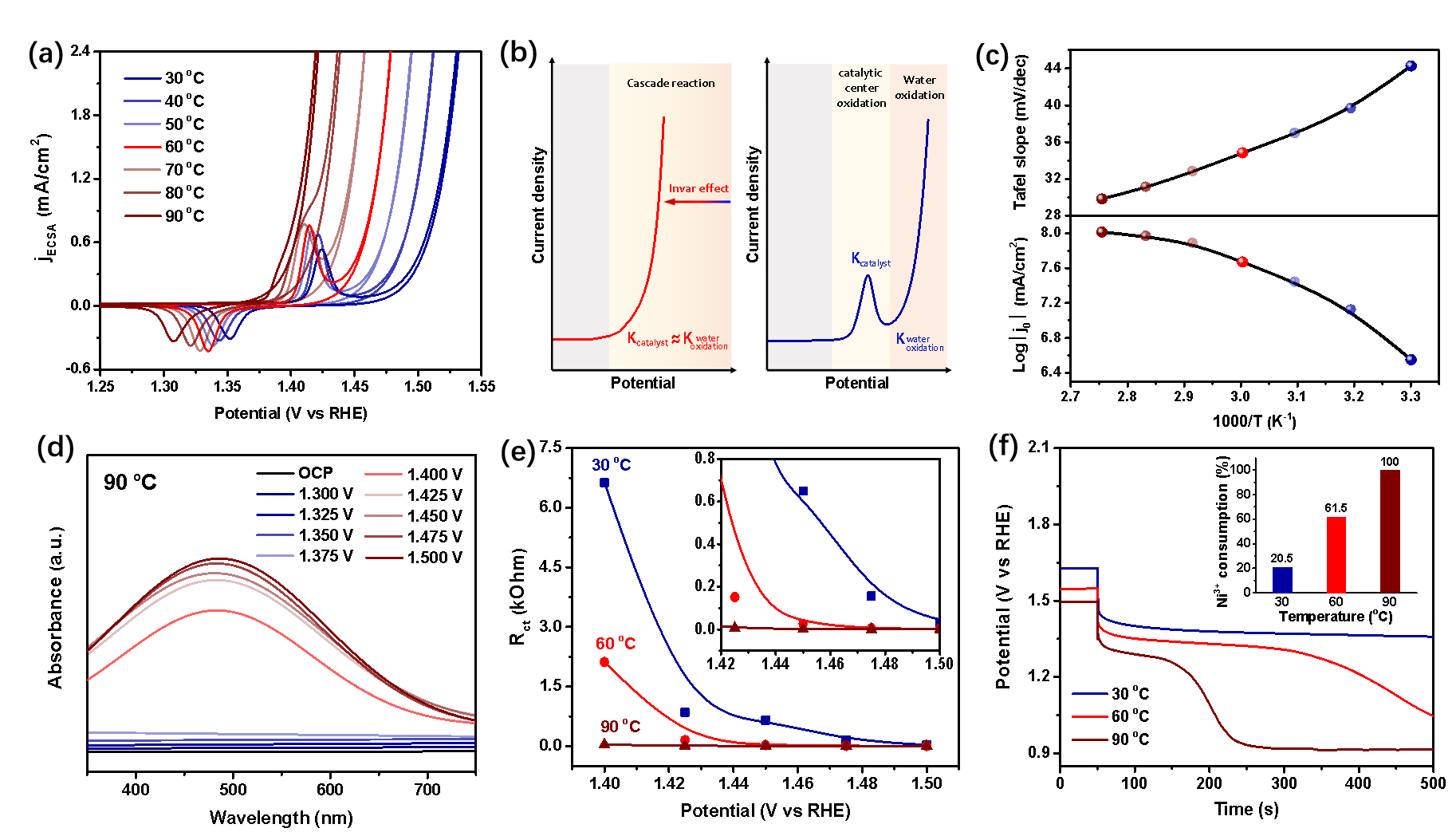 图3. (a) ECSA归一化的CV曲线。(b) 因瓦效应导致催化中心氧化和水氧化级联。(c) Tafel斜率(上)和lnk-T-1图(下)的温度依赖性。(d)原位紫外-可见吸收光谱监测Ni3+在FeNiOxHy层中的演变。(e) 由EIS数据拟合得到的Rct。(f) Vocp衰减曲线。插图为不同温度下Ni3+的消耗量。