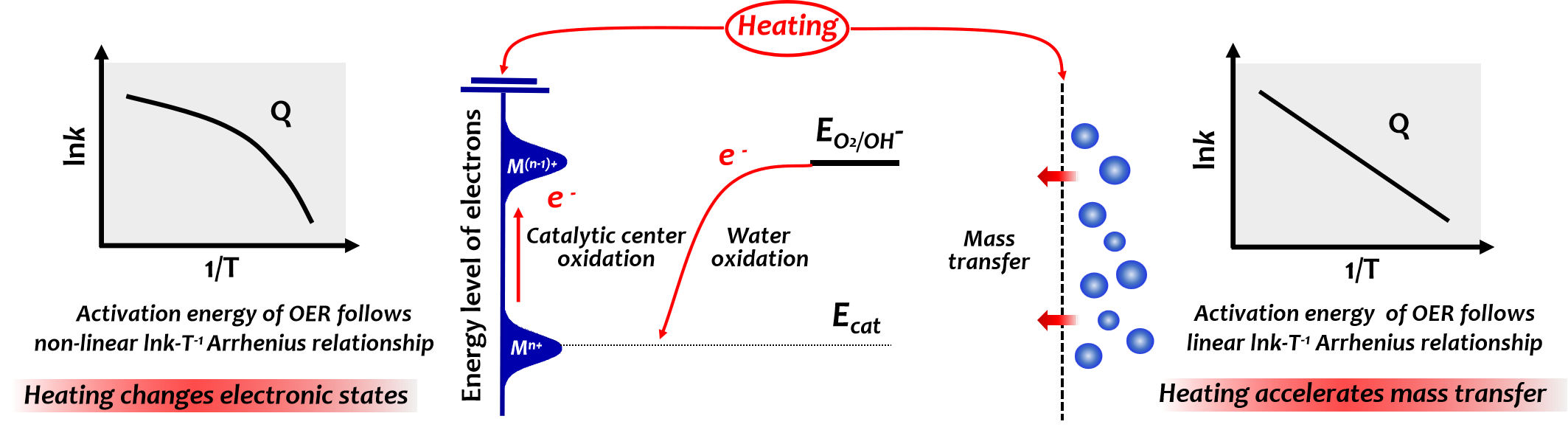 在电催化水氧化过程中,催化剂体相与催化层之间的电子转移势垒决定了电极极化到高价催化活性物质的难易程度。因此,寻找降低电子转移能垒的策略对于提高电-氢转换效率至关重要。在热促进化学反应动力学传统认知中,电-热耦合是通过热加速传质来加速电化学水氧化速率(图1),其反应速率常数k与绝对温度T之间服从lnk - T-1线性Arrhenius关系。在此种情况下,热并不改变材料电子态,也就是说,不改变材料催化活性。然而,如果存在材料热物理效应,则热敏感材料电子态会随着温度变化而改变,从而有可能降低电子转移势垒,热与电共同作用于改变电子化学势,超越热扩散效应,实现热和电强耦合效应,打破线性Arrhenius关系。基于此思想,课题组发现了系列材料热物理效应调变材料电子态促进催化反应动力学的热-电能量耦合催化水分解新机制。热调变材料电子态可以分为两类: 一类是具有临界转变温度的电子态切变,比如热致磁相变(Nano Lett. 2022, 22, 9131-9137;Adv. Funct. Mater. 2022, 32, 2111234; Energy Environ. Sci. 2024, https://doi.org/10.1039/D4EE04597A)和热抑制电荷歧化(PNAS 2024, 121, e2316054120);另一类是具有实时热响应的电子态连续转变,比如热应变(Nat. Commun. 2024, 15, 1780)。 此项研究将热激励连续电子态转变拓展至热因瓦效应调控电子转移通路的自旋构型,进一步丰富了能量耦合物理机制和能量耦合催化材料种类。