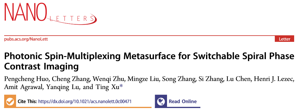 近日,betway88西汉姆联徐挺教授课题组发表了自旋复用超构表面用于实现动态可切换相差成像的最新研究成果。相关工作以“Photonic spin-multiplexing metasurface for switchable spiral phase contrast imaging”为题发表于《Nano Letters》(https://dx.doi.org/10.1021/acs.nanolett.0c00471)。