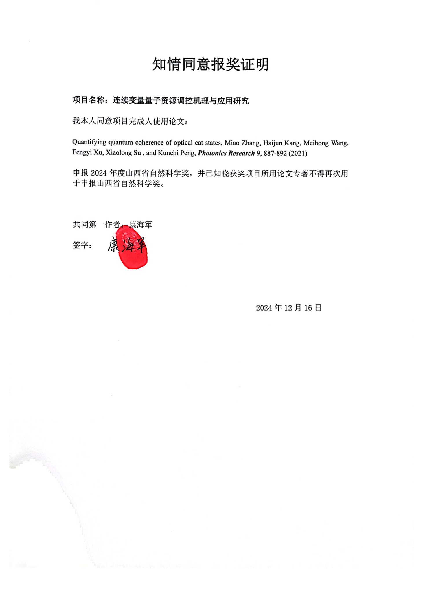 (2) Miao Zhang, Haijun Kang, Meihong Wang, Fengyi Xu, Xiaolong Su , and Kunchi Peng, Quantifying quantum coherence of optical cat states, Photonics Research 9, 887-892 (2021).