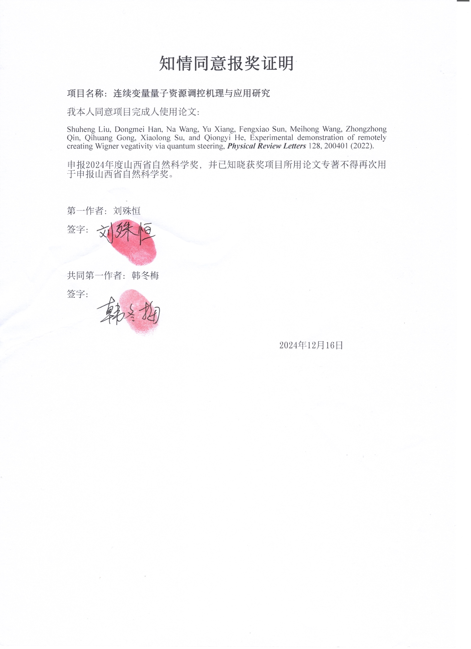 (5) Shuheng Liu, Dongmei Han, Na Wang, Yu Xiang, Fengxiao Sun, Meihong Wang, Zhongzhong Qin, Qihuang Gong, Xiaolong Su, and Qiongyi He, Experimental demonstration of remotely creating Wigner negativity via quantum steering, Phys. Rev. Lett. 128, 200401 (2022).