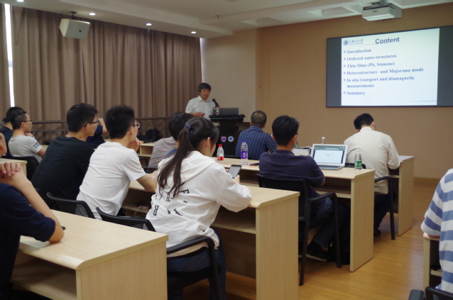 报告开始,贾金锋教授首先介绍了分子束外延(MBE)技术、扫描隧道显微镜(STM)技术与角分辨光电发射光谱(ARPES)技术,指出将分子束外延技术与STM、ARPES等技术相结合,可以实现原位表征,完成一些单独仪器无法完成的工作。随后贾教授围绕组合系统具体介绍了其相关研究工作,其中主要包含三个重要的量子材料体系:(1)通过STM-MBE系统成功制备出大面积均匀分布的全同纳米金属(In、Al等)人工晶;(2)通过MBE低温生长技术在斜切的单晶Si(111)表面获得具有量子尺寸效应(QSE)的超薄金属Pb膜,探明了QSE对超导转变温度、原子的表面扩散、分子的表面吸附、催化、薄膜粘附力等性质的影响;(3)成功制备出本征拓扑绝缘体Bi2Te3、Bi2Se3和Sb2Te3薄膜,获得具有拓扑性质的电子态随薄膜厚度的演变机制,并通过在超导体材料NbSe2上外延五原子层(quintuple layer,QL)的Bi2Te3薄膜,首次在实验室里成功观测到了马约拉纳费米子的零能模,这种粒子既是困扰物理学界80多年的正反粒子同体的特殊费米子,也是未来制造量子计算机的可能候选对象之一。报告最后贾老师总结了原位体系运用到量子材料研究的重要性。