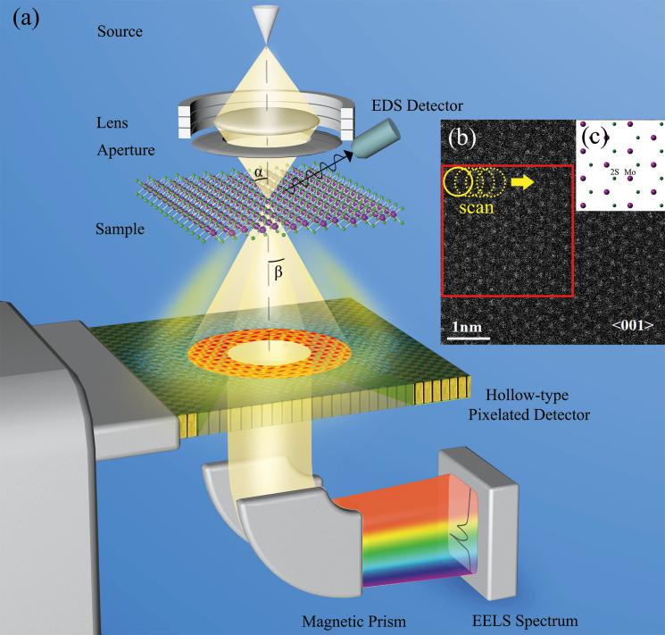 betway88西汉姆联固体微结构物理国家重点实验室,betway88西汉姆联,南大亚原子分辨电镜实验室王鹏教授课题组基于电子叠层衍射成像(Ptychography)技术,首次提出一种5维STEM的新成像方法(Hollow Ptychography)。通过这种方法,能够实现在一次成像过程中,同时获得材料的原子序数衬度像(HAADF)和高分辨相位像(Phase),以及与其一一对应的谱学信息(EELS和EDS)。图1(a)所示为此方法的光路原理示意图。在会聚电子束的扫描下,利用中空的高速相机(Hollow Pixelated Detector)采集二维衍射强度图案,同时,从相机中空部分透过的电子束可以进入电子能量损失探测器(EELS)形成谱像。