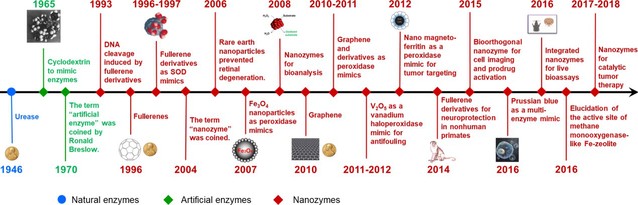 图1. 纳米酶的发展历程(作为参考,同时标注了天然酶及其它模拟酶的发展历程)。