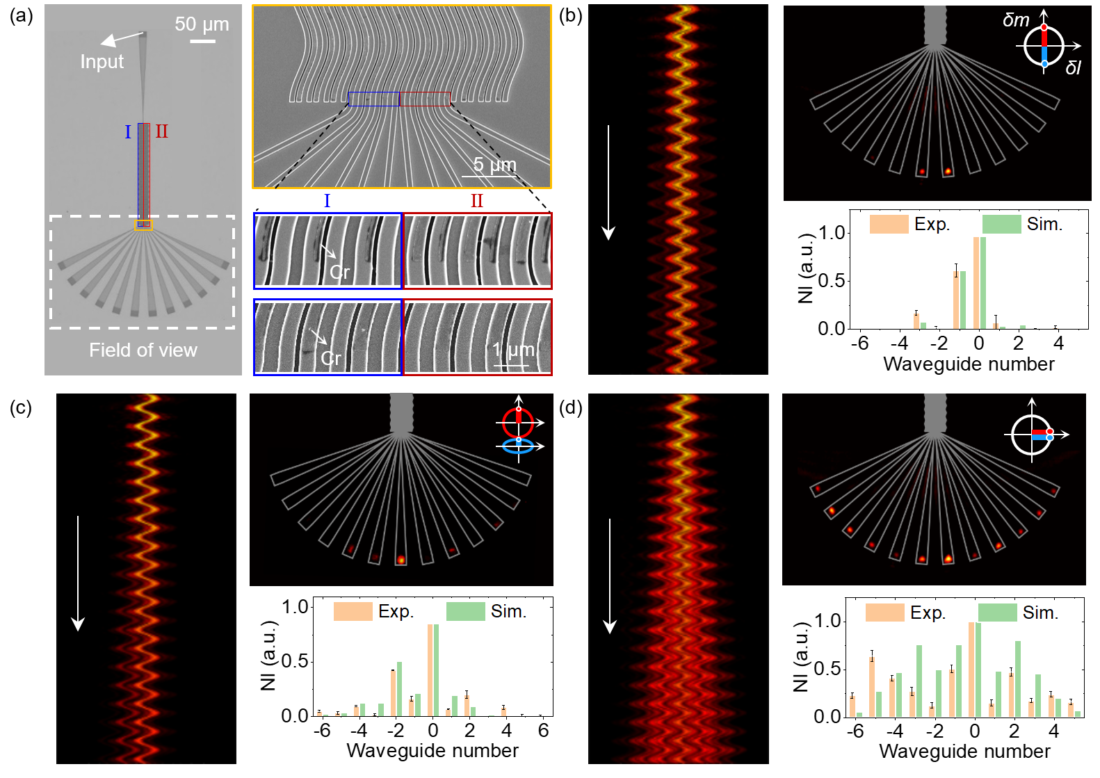 在实验中,研究人员加工了设计好的3组样品,包括“虚质量”翻转情形、外尔环相变情形、并以厄米平庸态样品作为对照。实验通过将1550 nm波长的激光耦合输入到界面附近的波导,并将输出端的信号通过扇形的结构引出(图4(a))。可以看出,在“虚质量”翻转及外尔环相变情形下,可以在输出端的界面处观察到很强的光场分布(图4(b,c)),而厄米的对照样品在输出端表现为发散的光强信号(图4(d))。