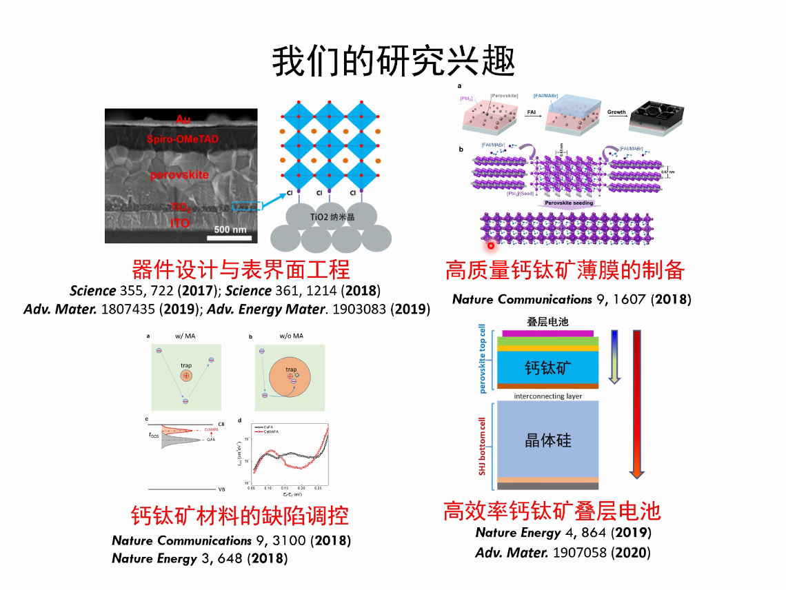 在介绍了钙钛矿太阳能电池的背景之后,针对当前钙钛矿太阳能电池器件的稳定性和效率这两大主要研究问题,谭教授从器件设计和表界面工程、高质量钙钛矿薄膜制备、钙钛矿材料缺陷调控三个方面向大家介绍了其在钙钛矿太阳能电池领域的探索研究,并提出了钙钛矿材料作为叠层器件的适用性。