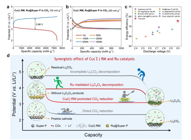 图2 Cu(Ⅰ) RM液相催化剂和Ru@Super P固相催化剂对锂-二氧化碳电池的协同催化作用