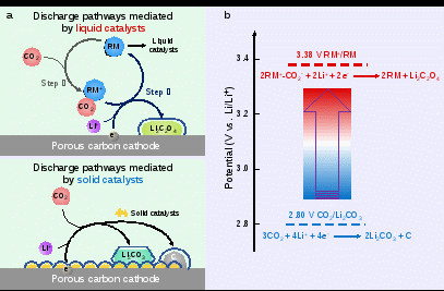 图1固相催化剂与液相催化剂媒介的锂-二氧化碳电池放电反应路径比较