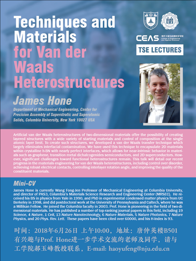 我们有幸邀请到Columbia University Prof. James Hone,作为TSE Lectures系列讲座的第三讲嘉宾。Prof. James Hone 学术报告信息见下,欢迎各位老师和同学参加!