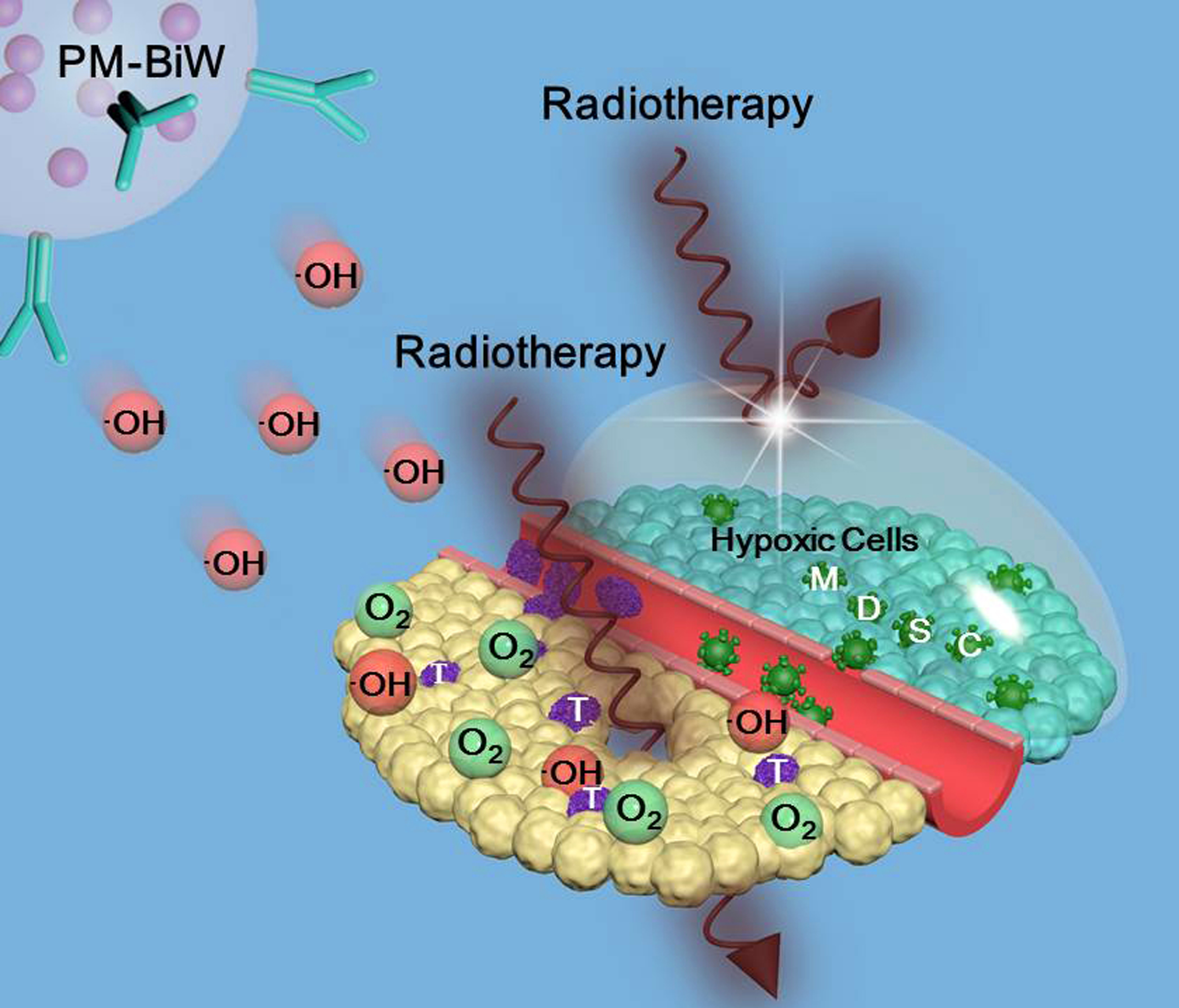 本课题中,我们通过分析发现,传统放射线治疗后加剧局部组织乏氧,通过HIF相关信号轴触发MDSCs的募集,因此理想治疗手段的核心要素是要有效避免高剂量射线的辐照,同时保证治疗效果,由此判断,增敏的放射治疗是一个理想的选择。为了增强癌细胞,尤其是深层乏氧组织癌细胞对于放射线的敏感性,引入活性氧组分或利用金属原子的韧致辐射诱导自由基产生是两大主流策略,我们的科学设想是能否通过单一纳米药物同时触发两种增敏模式,最大限度增强射线对于癌组织杀伤,同时需要解决的关键问题是该治疗策略既要触发自由基产生,同时又不能以组织内氧气为原料,否则将会导致乏氧情况恶化。