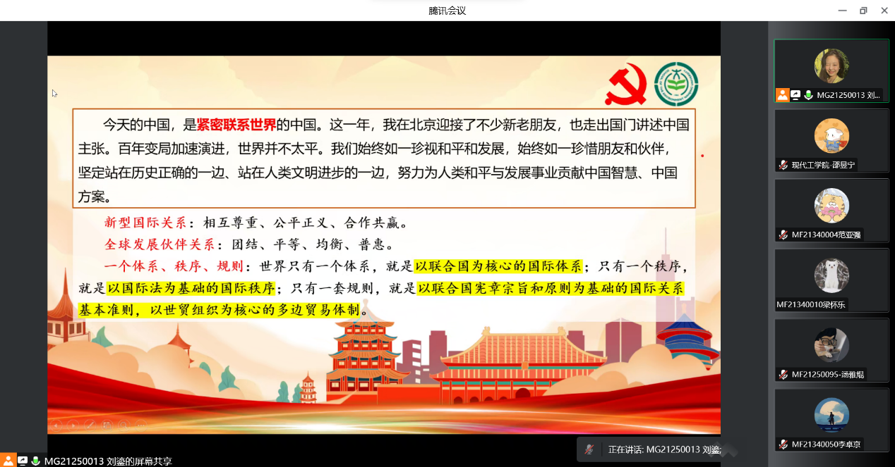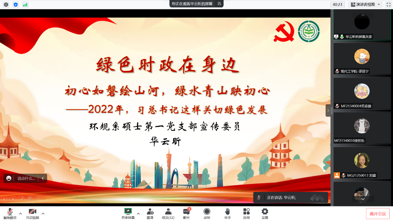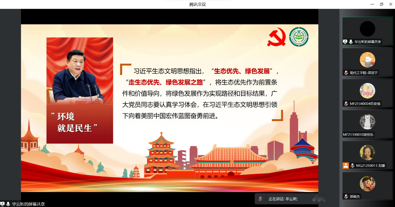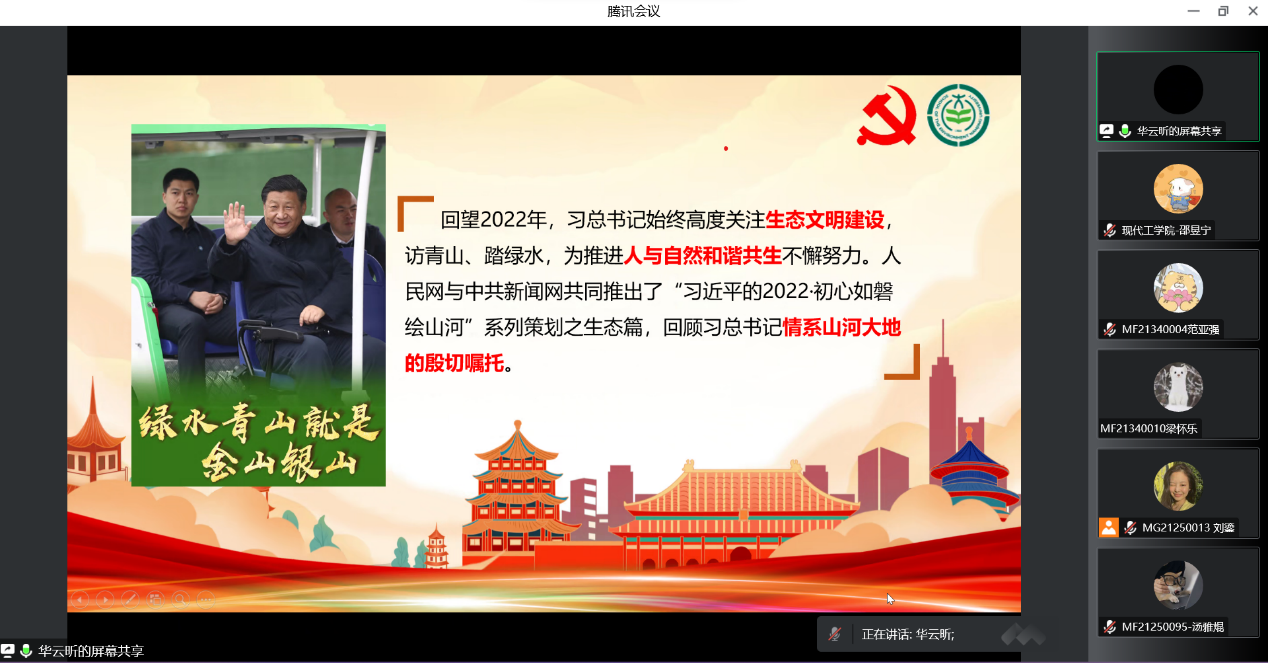 初心如磐绘山河,绿水青山映初心。环规系硕士第一党支部宣传委员华云昕以绿色发展为主题,以习近平总书记的足迹为主线,带领党员同志们“走青山,踏绿水”,重温习近平总书记的生态文明建设之路,回顾习总书记情系山河大地的殷切嘱托。“生态优先、绿色发展”,将生态优先作为前置条件和价值导向,将绿色发展作为实现路径和目标结果,广大党员同志要认真学习体会,在习近平生态文明思想引领下向着美丽中国宏伟蓝图奋勇前进。